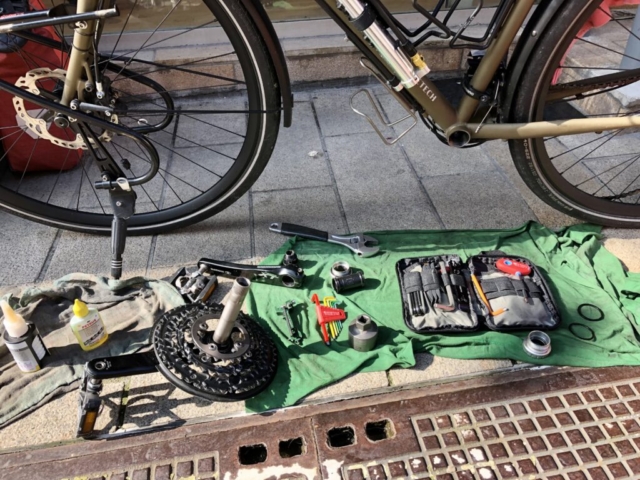 Draussen auf der Strasse zerlegte ich alle Teile des Trettlagers, reinigte alles, fette und baute es wieder zusammen.